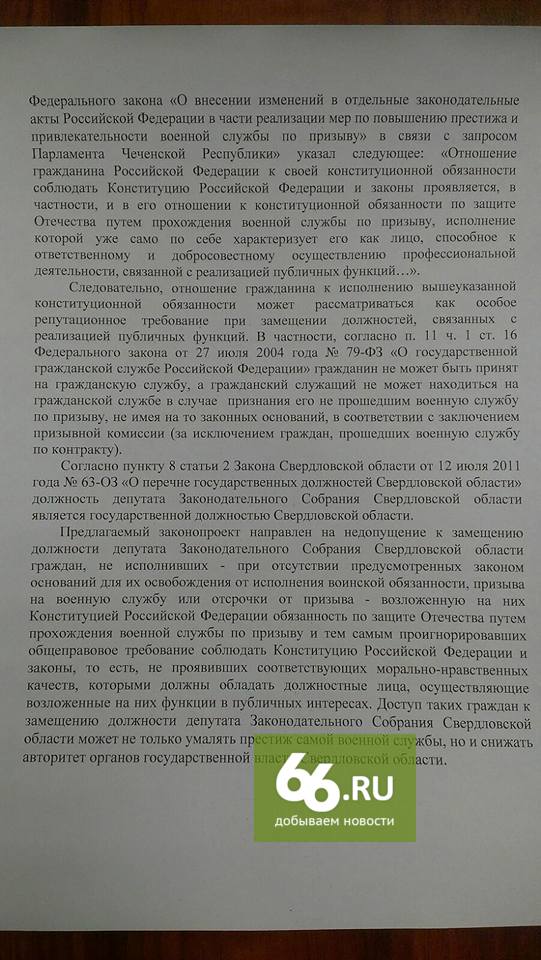 В пояснительной записке парламентарий указывает, что служба в армии является одной из конституционных обязанностей мужчины, а отношение к ней может рассматриваться как репутационное требование. Таким образом, во власти не будет людей, не проявивших соответствующих морально-нравственных качеств. «Доступ таких граждан к замещению должности депутата Заксобрания Свердловской области может не только умалять престиж военной службы, но и снижать авторитет органов государственной власти региона», — продолжает Иванов.